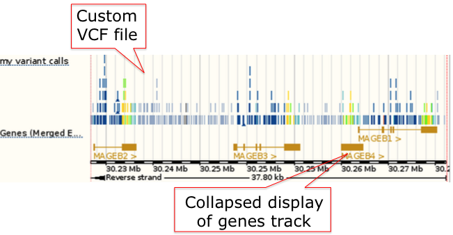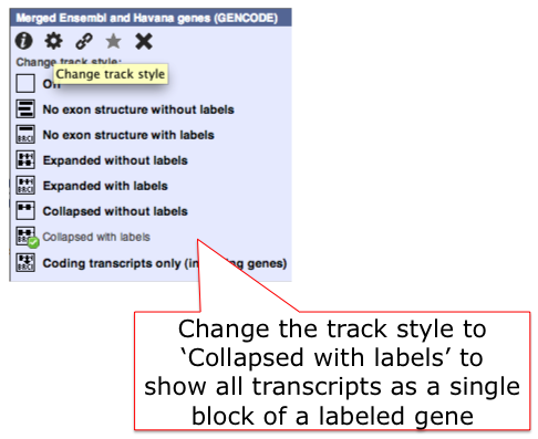 To change the default to show a single block for each gene rather than individual splice variants, go to the track name for the gene track, hover over the cog wheel, and change the setting from 'normal?' to 'collapsed'.