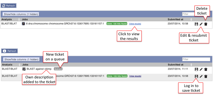 The table lists jobs that are currently running or recently completed. A ticket ID is assigned to each job and additional information is provided i.e. Analysis, Jobs and Submitted at (date and time). You can customise the table by showing/hiding columns.