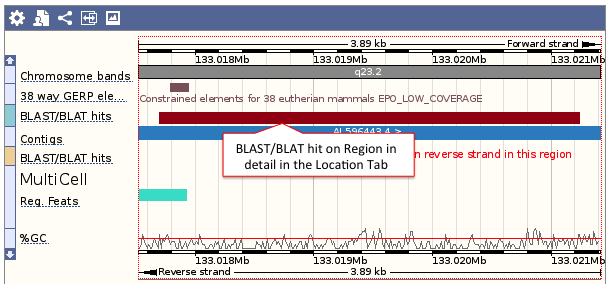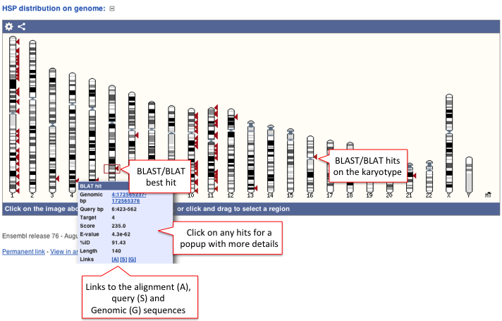 - Genomic location: shows the BLAST/BLAT hit on the Region in detail view in the Location tab of the Ensembl Genome Browser. The BLAST/BLAT hit will appear as a red bar along the genome. You may want to click on the red bar to view a summary of the search, including E-Value, %ID, etc.