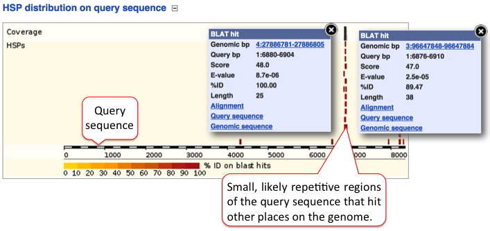 The HSP distribution can be visualised on the query, which is shown as a chain of black and white boxes. Fragments of the query sequence that hit other places in the genome are shown as red boxes (click on those for more information). Usually these fragments are small (they vary between 100-200 nt) and map to various locations. These sequences are of low complexity, such as repetitive sequences.