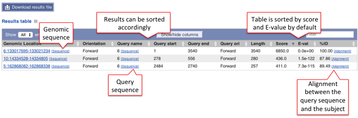 This table lists all hits in order of high to low score (and E-value) but it can be customised to show/hide columns. The results can be sorted by any parameters available in the table.