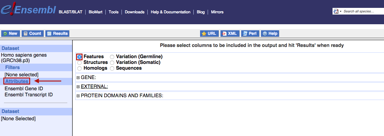 By clicking on the "Attributes" button on the left panel, you will access the mart attribute page. This page allows you to select your desired output; the default output is "Ensembl Gene ID" and "Ensembl Transcript ID" in the Ensembl Genes mart. The attributes are organised in pages that you can access by selecting the radio buttons as displayed by the red box on the image below.
