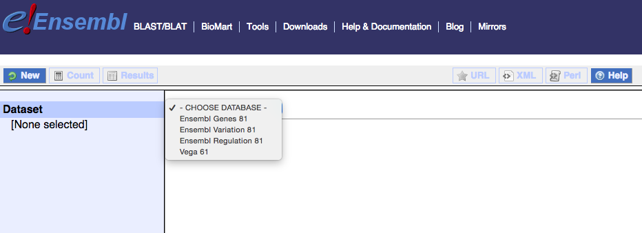 First, select a mart database which will correspond to the type of data you are interested in. In Ensembl, you can choose data from one of our four mart databases: