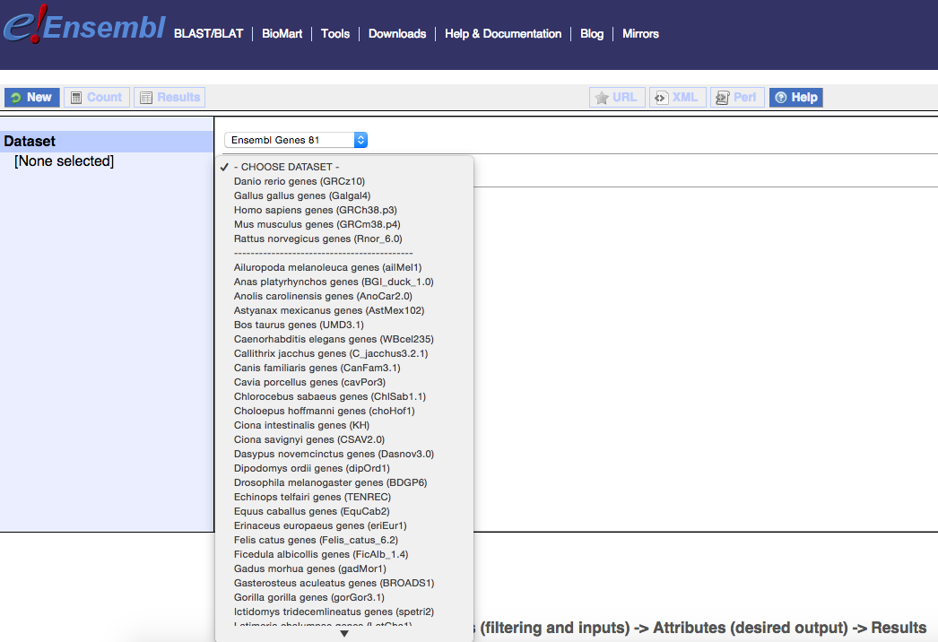 Next, select a mart dataset which correspond to the species you are interested in and want to retrieve data from.