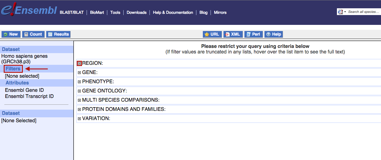 BioMart allows you to restrict your query with information that you know, e.g: input a list of IDs, restrict to a region. You can access the filter page by clicking on the "Filters" button located on the left panel. Filters are organised into different sections, clicking on the "+/-" boxes will expand/collapse a section and display its content.