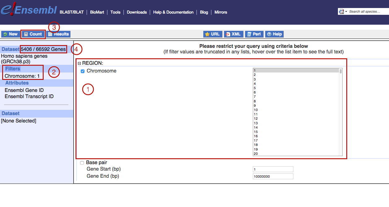 In the following image, I have expanded the "Region" section by clicking on the "+" box as indicated by the number 1. Then, I have selected "1" in the chromosome list to restrict my query to all the genes located on human chromosome 1. The left panel now displays "Chromosome: 1" as indicated by the number 2. Clicking on the "Count" button as indicated by number 3 will display the number of Ensembl genes that the query will return next to "Dataset" as indicated by the number 4. This mean that we have 5406 Ensembl Genes located on the human chromosome 1.