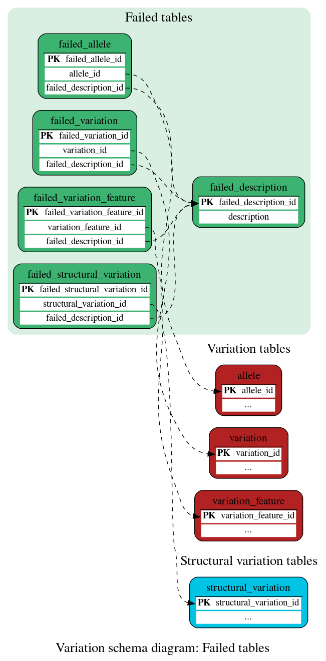 These tables define the list of variants/alleles flagged as "failed" in the Variation pipeline.